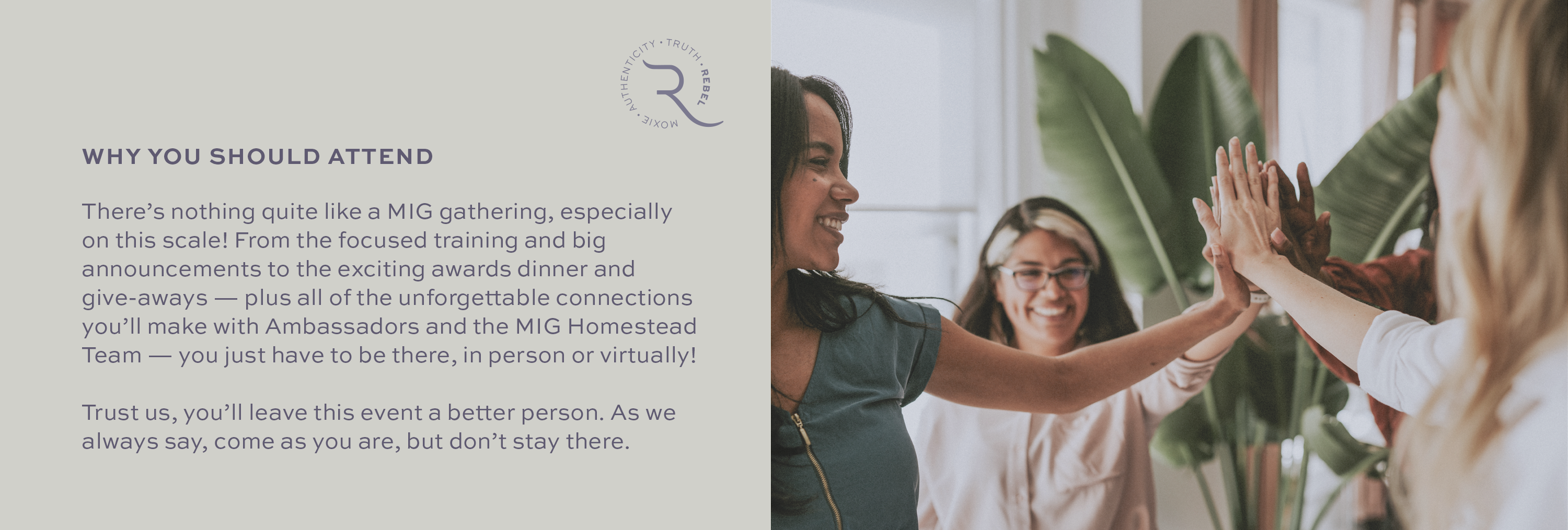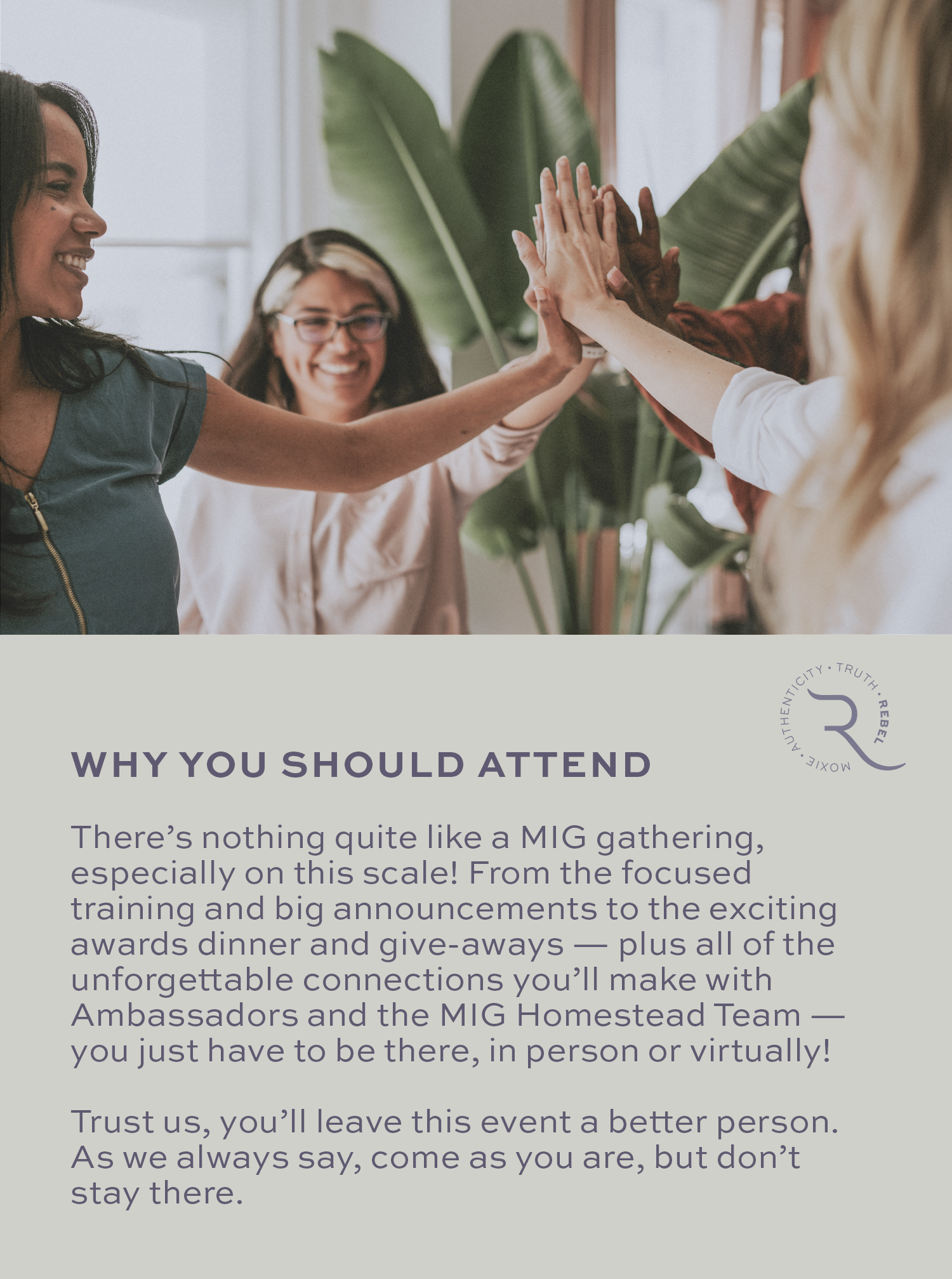 The Live 2021 Beauty Rebellion Convention is an exceptional opportunity to more clearly see your path to purpose with MIG and how we are restoring truth in beauty. Join your Ambassador peers, Jaime Cross & the Homestead Team, and inspiring guest speakers for an event like no other.
